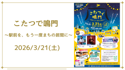 鳴門駅前で、こたつを囲みながら楽しめるイベント 「こたつで鳴門」 が開催されます。鳴門市出身のシンガーソングライターなどによるステージLIVE、鳴門市長とのトーク企画「日本一ゆるいこたつ会議」、豪華景品が当たるBINGO大会、グルメ屋台が多...