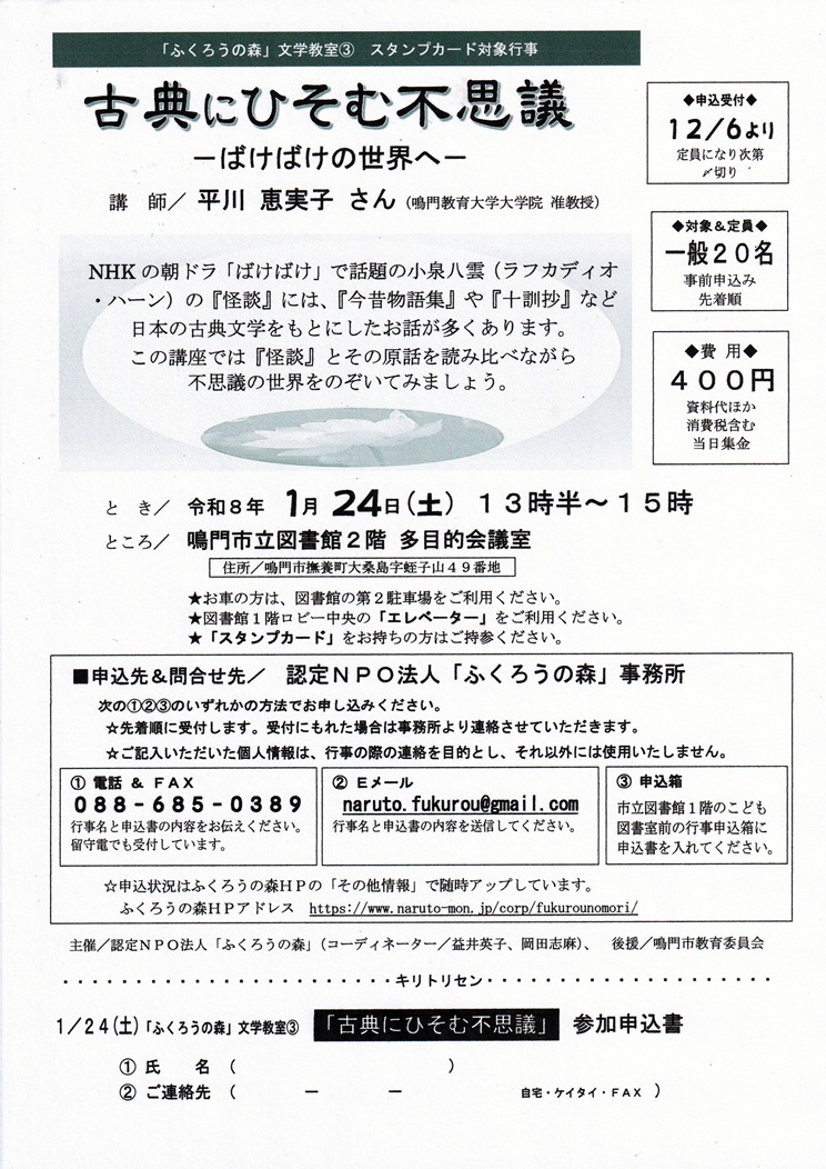 ・ 1/24(土)文学教室「古典にひそむ不思議」(定員:20名、対象:一般)