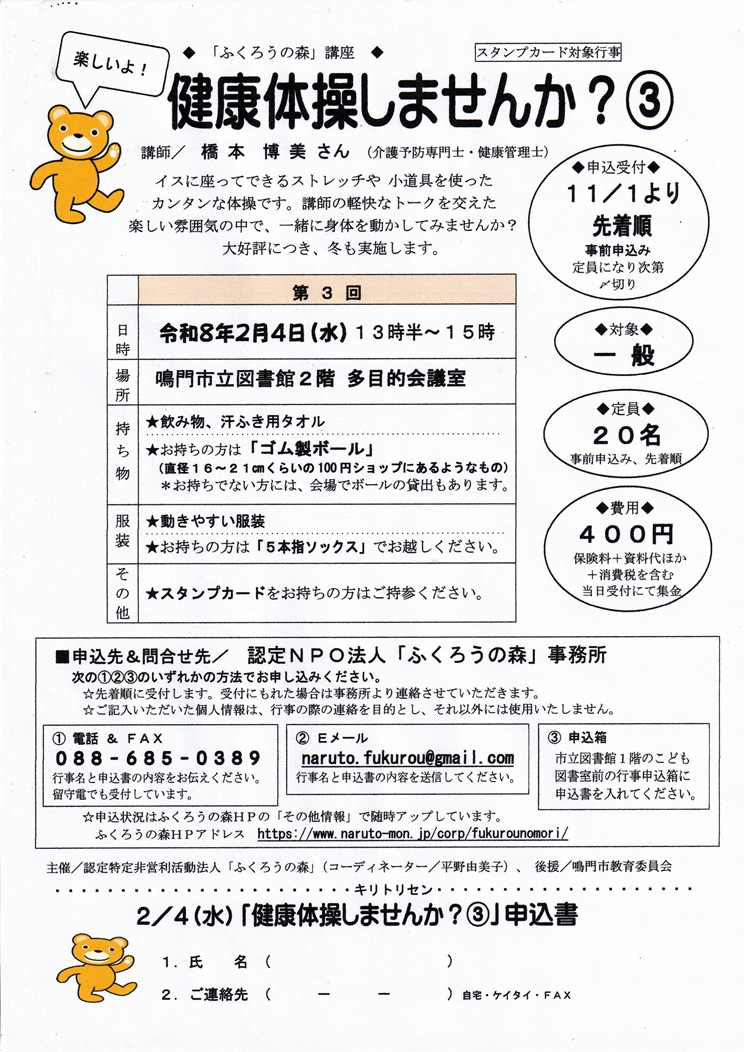 ・ 2/ 4(水)ふくろうの森講座「健康体操しませんか?③」(定員:20名、対象:一般)