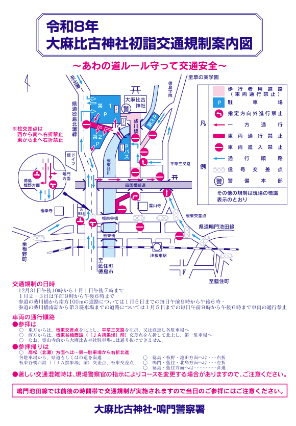 2026年(令和8年)の初詣も、大麻比古神社周辺では、交通規制が実施されます。