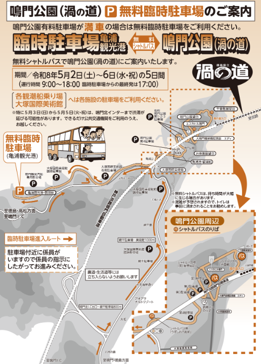 亀浦港埠頭用地に臨時駐車場を設け、シャトルバスを運行し、鳴門公園まで送迎いたします。