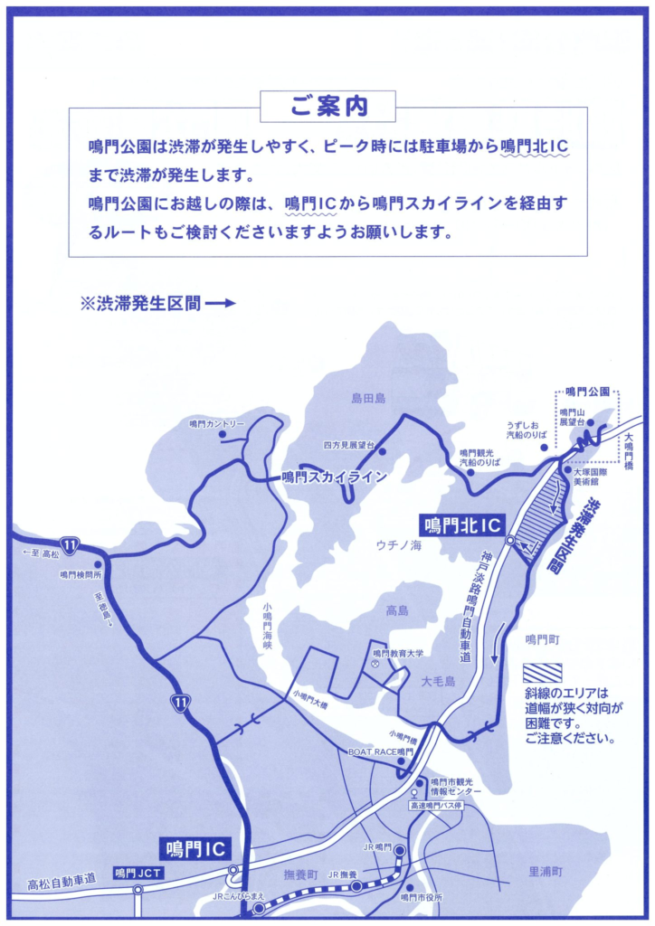 特に5/3から5/5の間は、交通集中により渋滞が鳴門北IC付近まで伸びる恐れがあります。