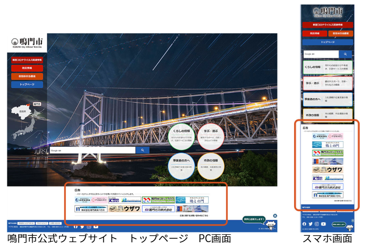弊社は、鳴門市公式ウェブサイトのバナー広告の広告代理業務をさせていただいてます。