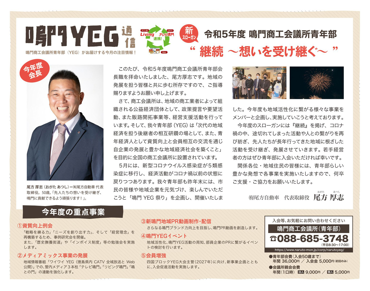 鳴門商工会議所青年部(鳴門YEG)がお届けする鳴門YEG通信。 メディアミックス事業として当部制作CATV地域番組「ワイワイYEG(徳島県内全域放送とWeb公開)」他、管内メディア3本柱「テレビ鳴門」「リビング鳴門」「鳴との門」連動で鳴門のPRを行っております。